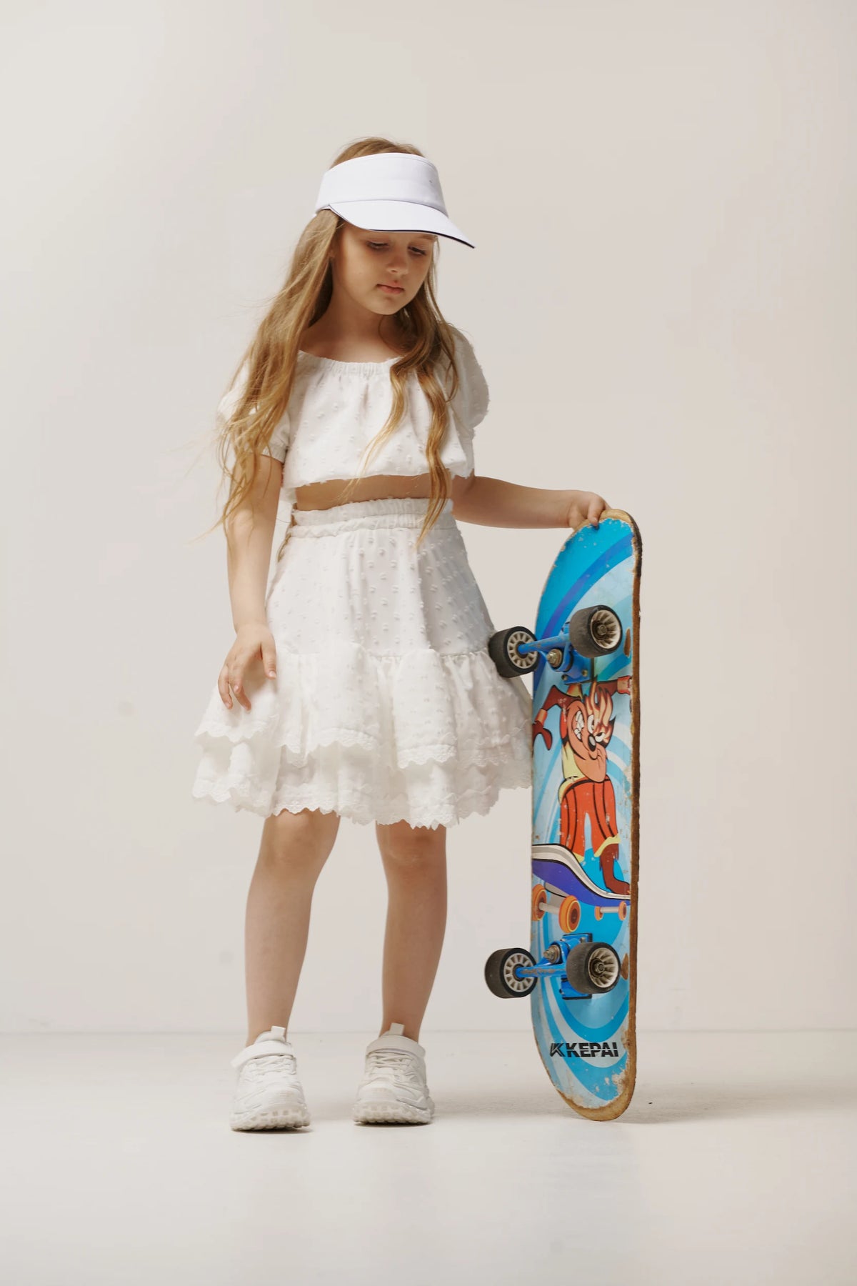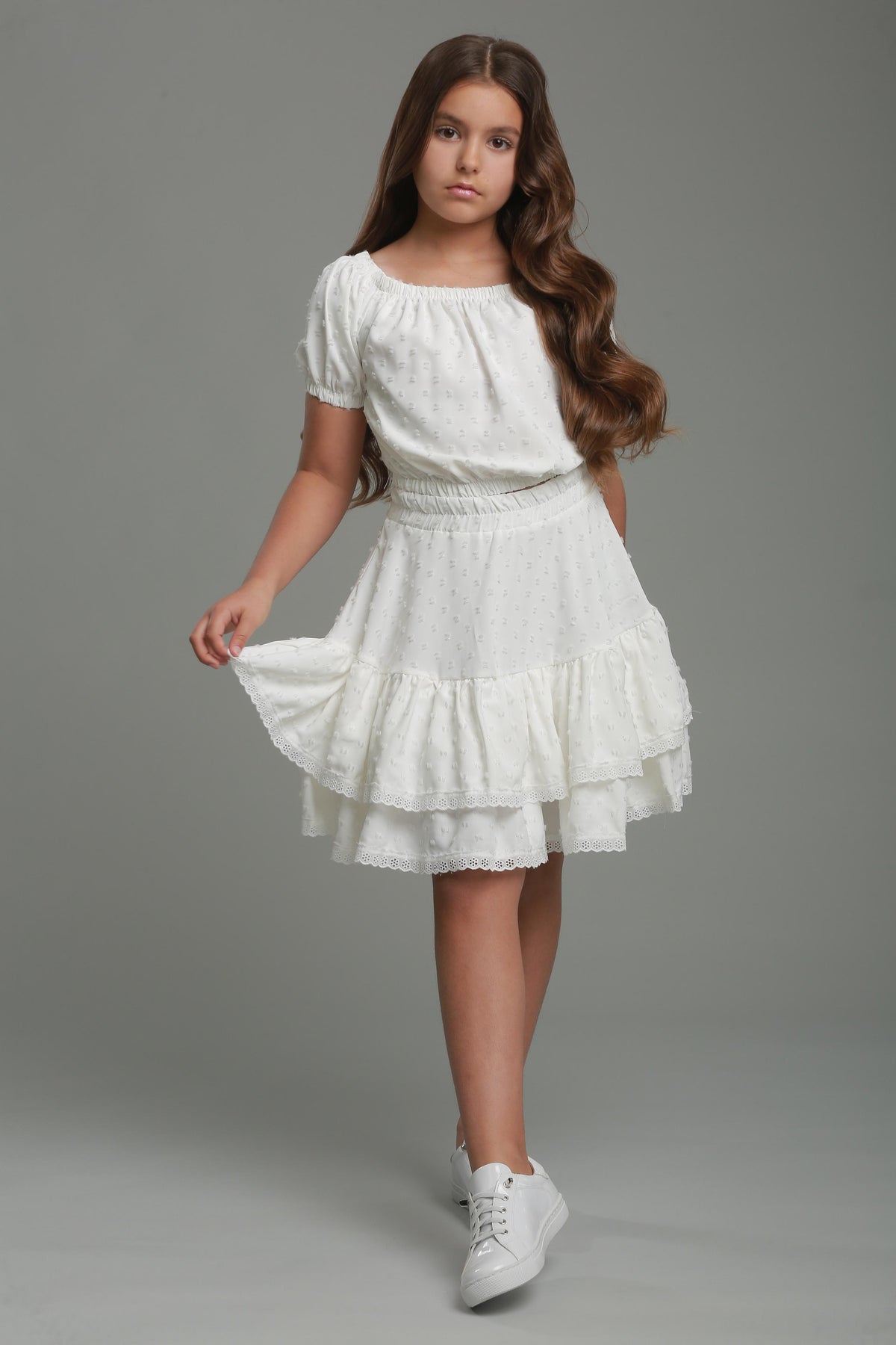 Літній костюм для дівчинки з софту — святковий і зручний: топ і спідниця з фестонами по краю та вишитими елементами.