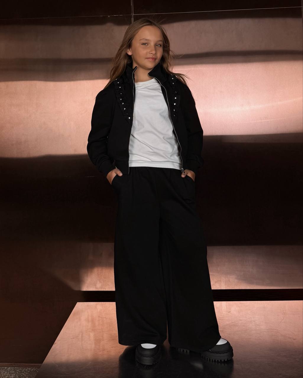 Цей костюм виконаний з бархатистої тринитки на велюровому утепленні.