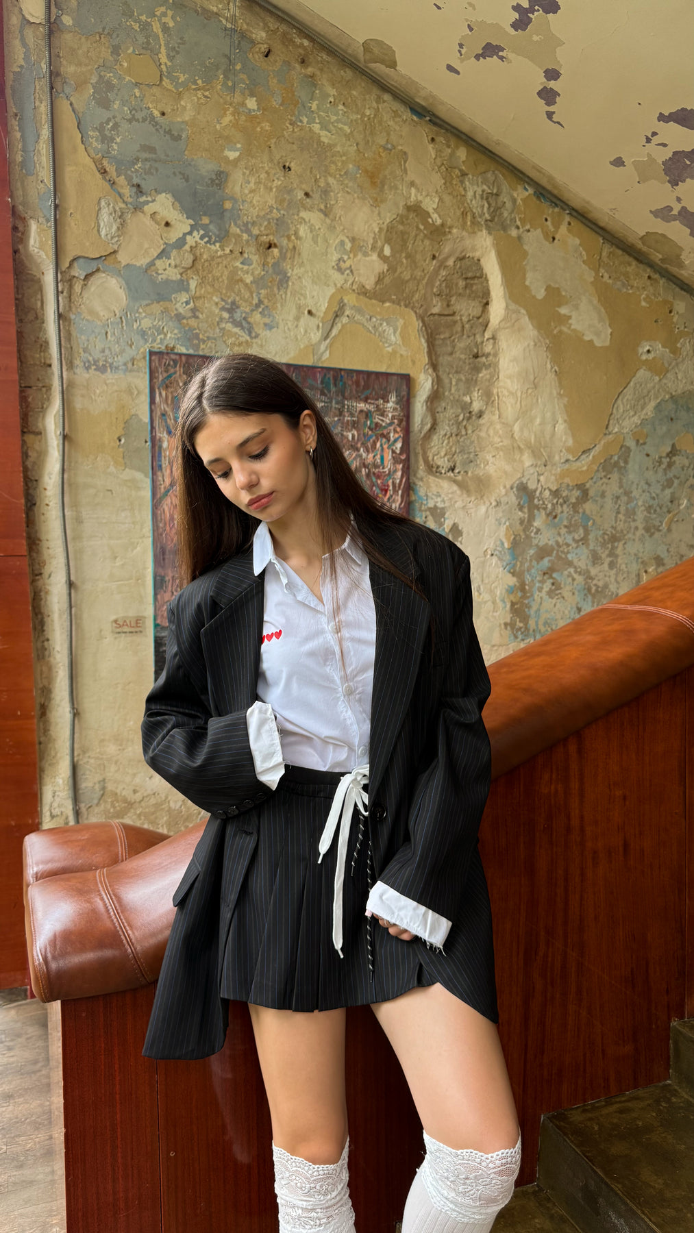 Стильний костюм у трендовому силуеті — оверсайз піджак з вшитими контрастними манжетами та спідниця-шорти з подвійним поясом і утяжкою. Виготовлений з високоякісної костюмної тканини, яка тримає форму та виглядає вишукано. Піджак має класичний крій із сучасною подачею, а спідниця-шорти забезпечують комфорт і свободу рухів. Ідеальний варіант для школи, офісу чи міських образів.