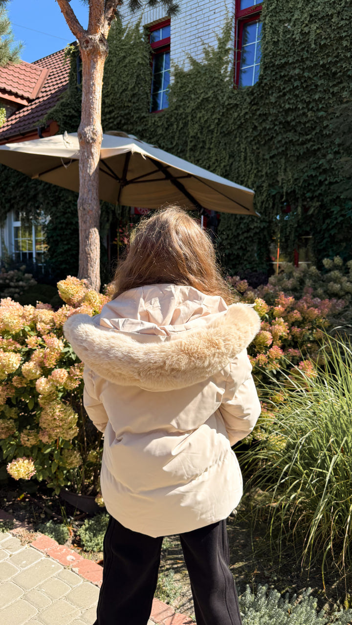 Укорочений пуховик з водовідштовхувальної матової плащівки, утеплений тінсулейтом. Усередині — підкладка з еко-хутра, що дарує максимальний комфорт у холодну погоду. Модель має зйомний капюшон із пишною опушкою, застібається на блискавку та кнопки, а також оснащена утяжкою по низу для ідеальної посадки.