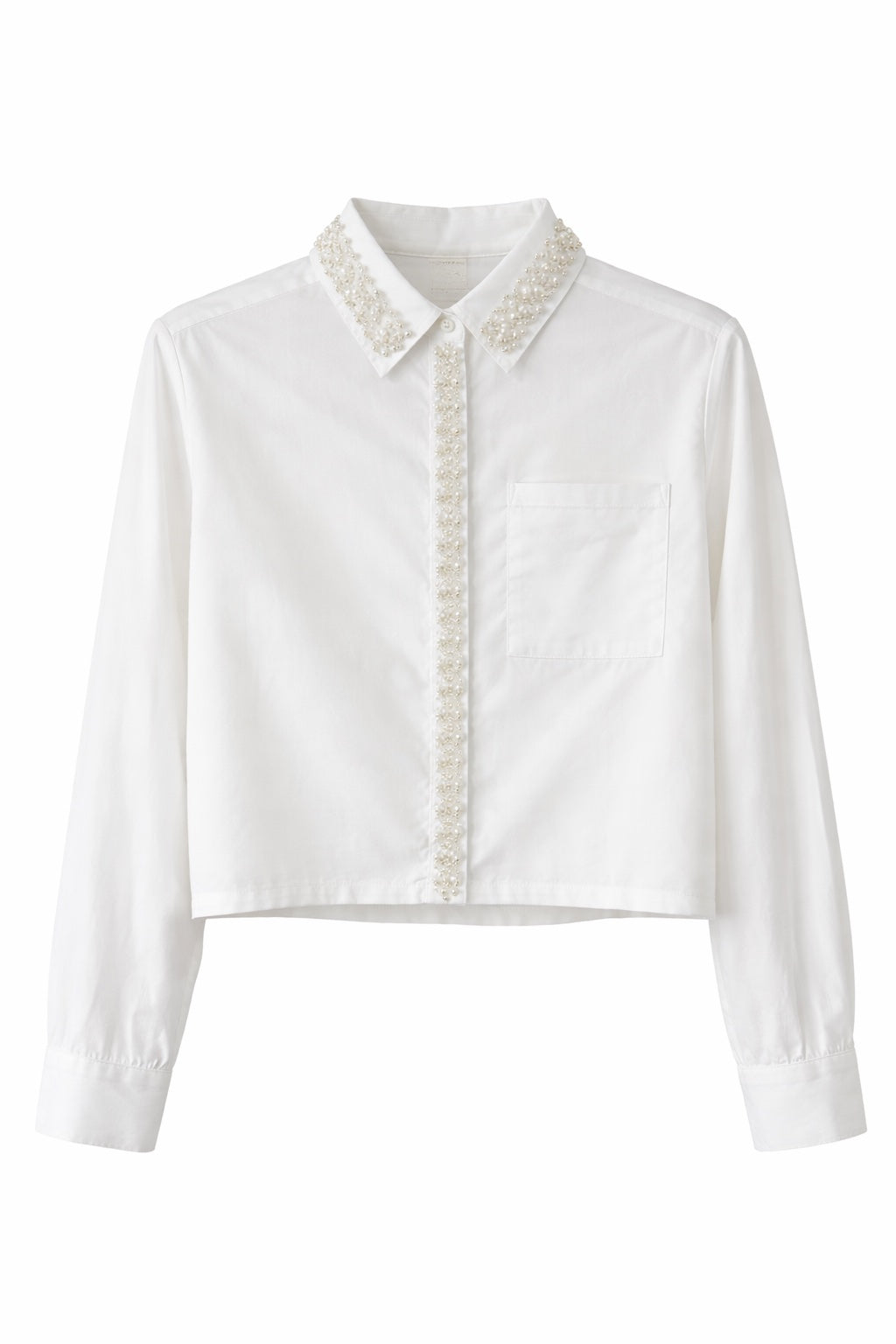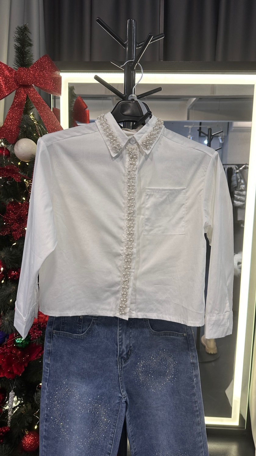 Бавовняна сорочка, декорована вишивкою бісером та перлинками. На гудзиках.