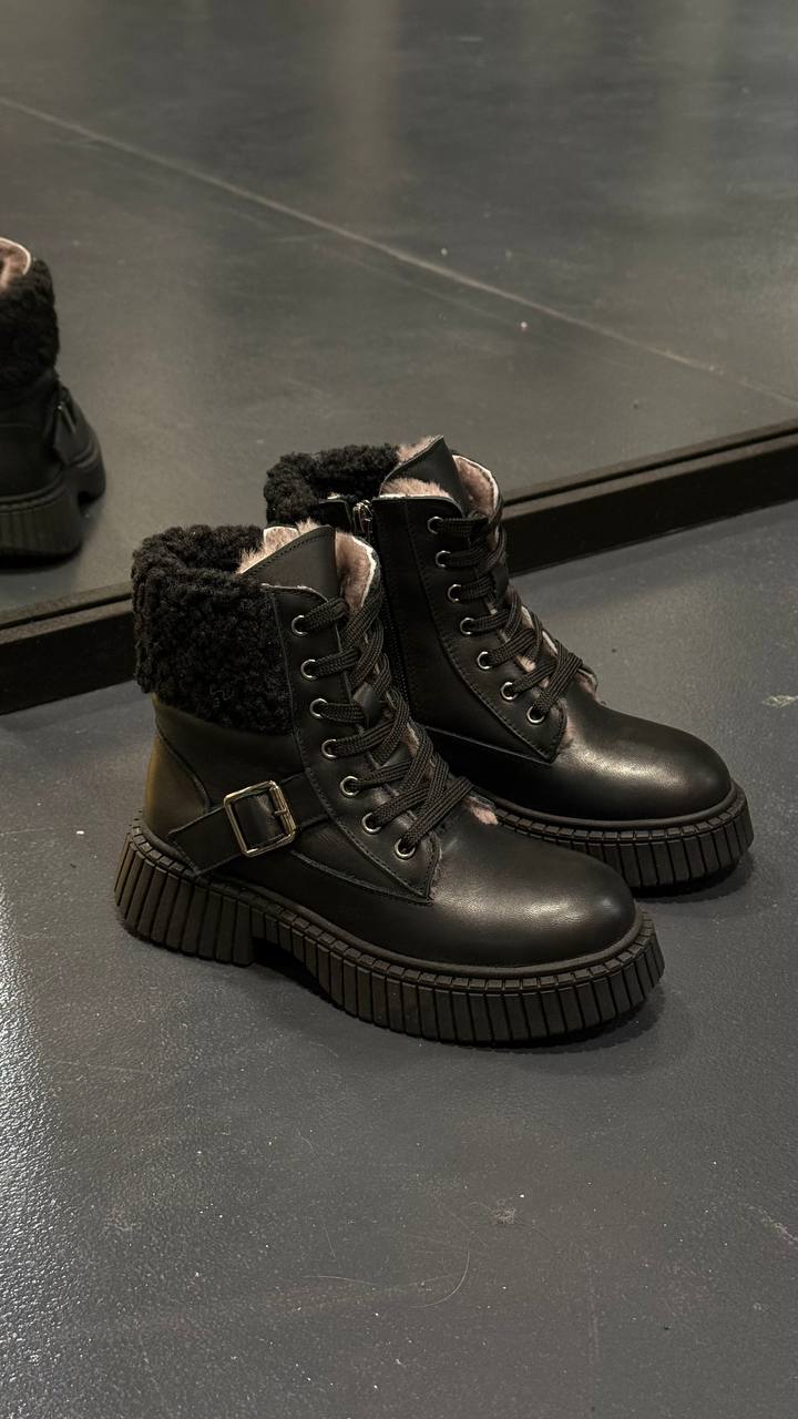 Черевики виконані з натуральної лакованої шкіри, мають блискавку та шнурки для комфорту та регулювання повноти. Модель утеплена натуральною овечою цигейкою до -25* морозу.