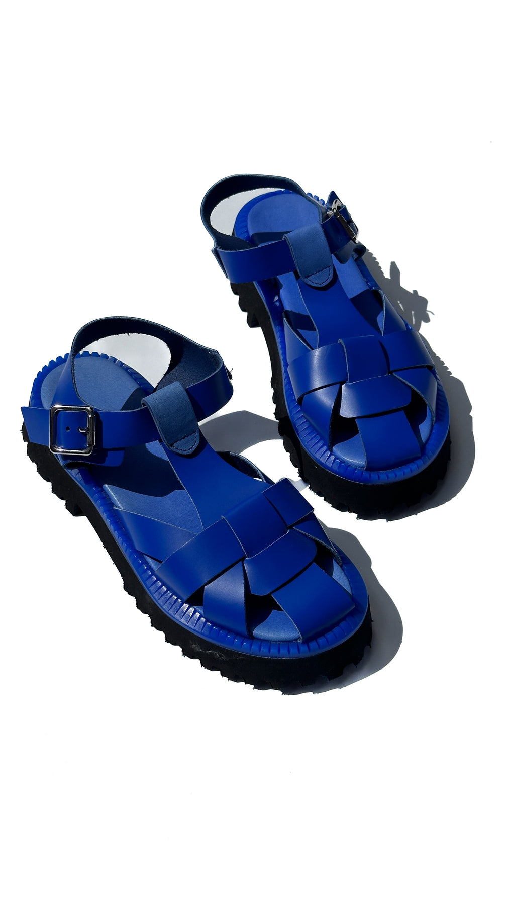 Невагомі босоніжки на танкетці — яскравий синій електрик колір, натуральна шкіра, зручна фіксація на стопі.